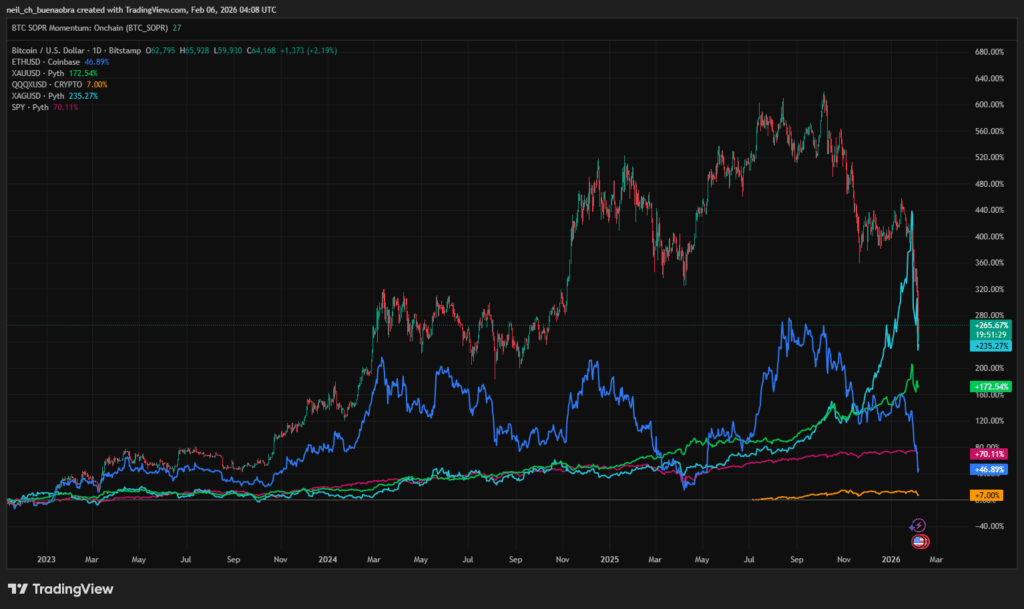 Over the few weeks, Bitcoin and Ethereum fell hard, and they did it alongside stocks, tech, and even assets that usually catch a bid when fear hits. Bitcoin dropped from the mid-$80,000s in mid-January to briefly below $64,000 on Feb 5, roughly a 50% slide from its $126,000 peak in October 2025. Ethereum followed with high double-digit losses, breaking below $4,000 after topping $7,000 last fall, per exchange data. The timing sits near the familiar “post-halving hangover” window, but the feel of the move was broader than crypto, it looked like a risk-off wave rolling through everything.