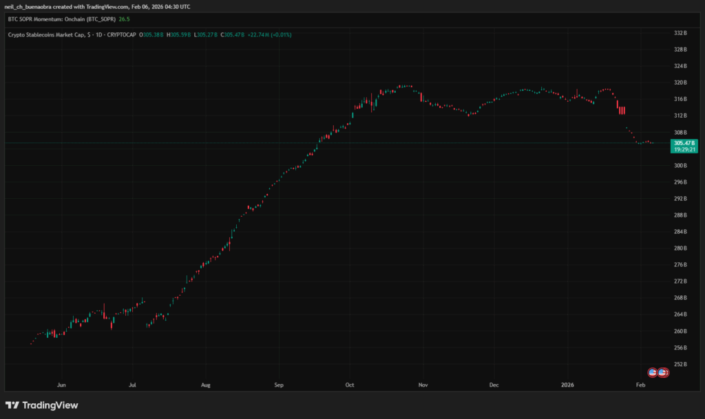 When everything is down at the same time, “rotation” is usually the wrong mental model. The picture painted here is simple: money moved toward cash and Treasuries, and a chunk of it just stepped back. Inside crypto, there was no broad “Bitcoin into alts” shift; the stablecoin data is used to argue that some capital exited entirely. The stablecoin market cap is cited at $310.4 billion on Jan 16, 2026, then down by roughly $6 billion over the next two weeks, drifting from around $311 billion in mid-January to about $305 billion by Feb 1. Binance’s USD balances are described as falling over the same stretch, which fits the idea of liquidity leaving exchanges rather than hiding on-platform.