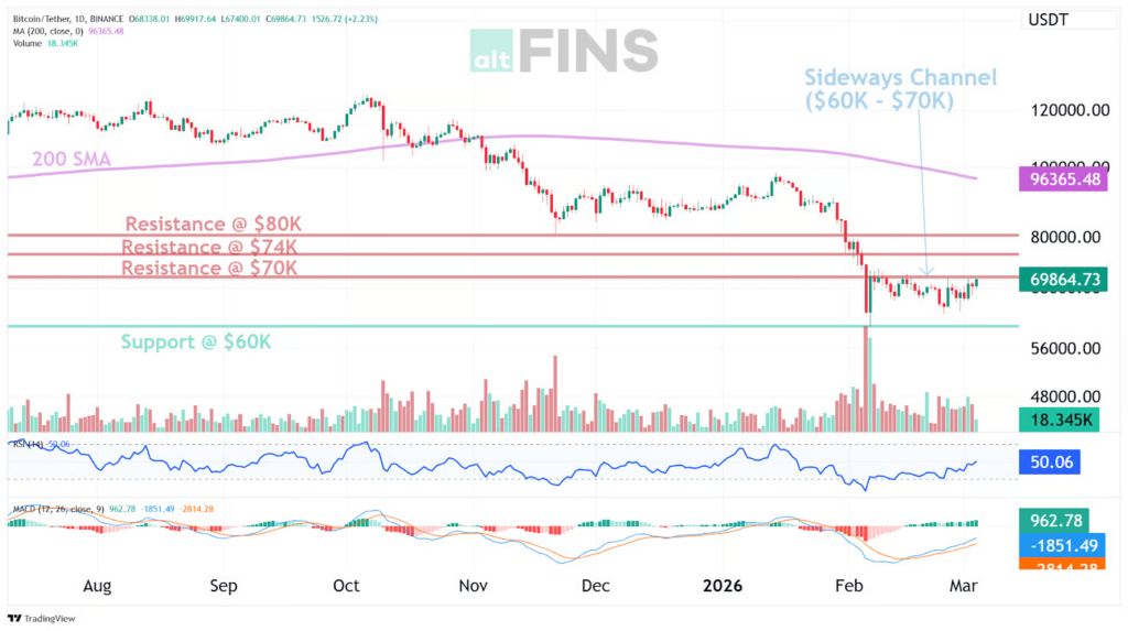 A sideways channel was treated as the primary pattern, and the $60,000 to $70,000 band was used as the operative range that had contained price. A break above $70,000 was described as having been registered, but confirmation was not established by the breakout print alone, and it was explicitly left as uncertain pending a retest and hold. The nearest resistance zone was placed at $74,000, with $80,000 identified above it as the next major supply area, and the nearest support zone was placed at $60,000.