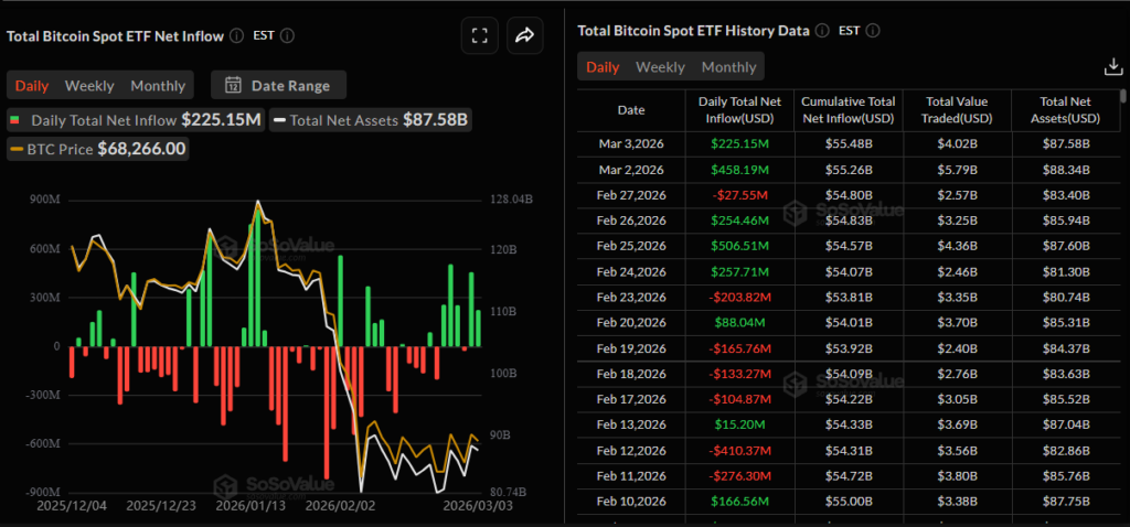 - US spot Bitcoin ETFs add $225 million as BlackRock IBIT offsets redemptions: A combined net inflow of $225.2 million on Tuesday was reported for spot bitcoin ETFs. The move was presented alongside a larger five-session inflow figure of about $1.4 billion.