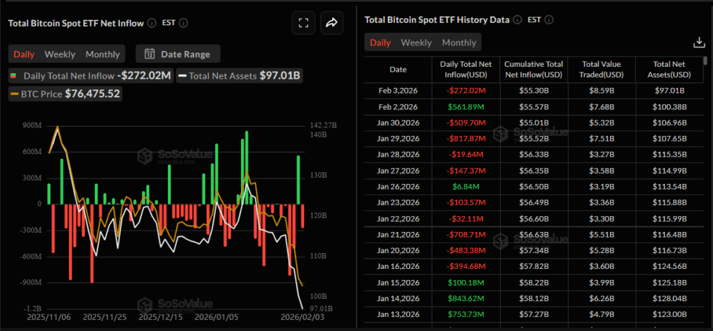 - Bitcoin ETF assets slip below $100B with fresh $272M outflows: Spot Bitcoin ETF assets fell below $100 billion after about $272 million of net outflows, and this was the first sub-$100 billion reading since April 2025 on SoSoValue data. The drawdown coincided with BTC sliding below $74,000 and total crypto market cap dropping from about $3.11 trillion to $2.64 trillion over the week, based on CoinGecko data.Â