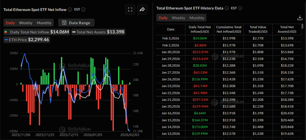 Spot ETH ETF positioning was dominated by outflows across the late January selloff days, while the most recent reported session was marked by a modest inflow that did not reverse the broader drawdown in net assets. A net inflow of about $14.06 million on Feb 3 was reported for spot ether ETFs in coverage referencing SoSoValue, as described in ETF inflows. Total net assets near $13.388 billion and cumulative net inflow near $11.986 billion were also reported as summarised in net asset data. The flow profile was therefore kept consistent with de risk positioning into a technical breakdown, with only limited evidence of near-term stabilisation having been presented by the latest daily print.
