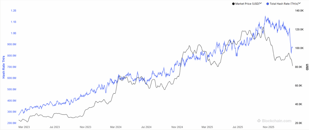The question of whether the drawdown should be treated as worrying is therefore a question of persistence and economics. A temporary hashrate dip tends to be self-correcting through the difficulty mechanism, because slower blocks are followed by lower difficulty at the next reset, which improves revenue per unit of hashrate for miners who remain online. Concern rises when the hashrate remains depressed after the reset window and when unit economics stay weak, because that combination points to margin stress rather than a pure uptime event.