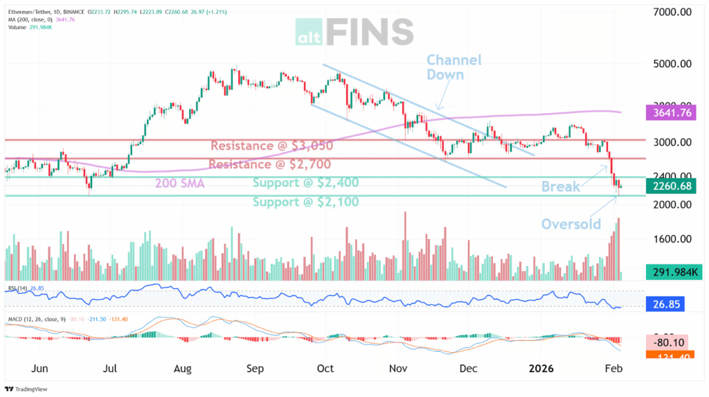 Key levels were defined by support near 2,100 followed by 2,000, while resistance was identified near 2,700 followed by 3,050, and the structure was kept consistent with a downtrend after the loss of 2,700. A tactical rebound profile was supported by oversold momentum near support, but durability could not be confirmed without higher daily closes being established and momentum readings being improved. A downside invalidation for the immediate support thesis was represented by sustained acceptance below 2,100, while a clean loss of 2,000 was expected to deepen downside risk by placing price beneath the nearest defined demand band.