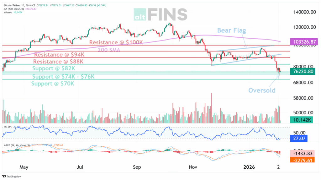 The breakdown below $82,000 was treated as the structural pivot, with the prior range of $82,000 to $94,000 having been described as resolved to the downside. The $74,000 to $76,000 zone was framed as the nearest support band now being tested, with $70,000 marked as the next lower support if acceptance below the current base is sustained. Overhead supply was defined at $82,000, with additional resistance bands at $88,000 and $94,000. A higher cap was also identified by the 200 day average region, with the 200 SMA shown near $103,326.87, leaving mean reversion levels well above spot.