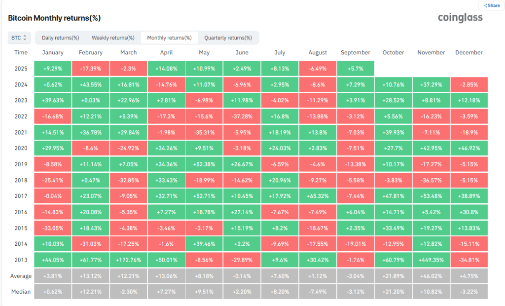 September is commonly treated as a red month for risk assets, or at best a sideways grind. Multi-year seasonality in equities and bitcoin has skewed weaker in September, with average and median returns lagging other months. In 2025, that template was only partly observed. Bitcoin spent the first half of the month firm, then faded into the 24–27 September window as positioning de-risked, and the market faded into the 24–27 September window.