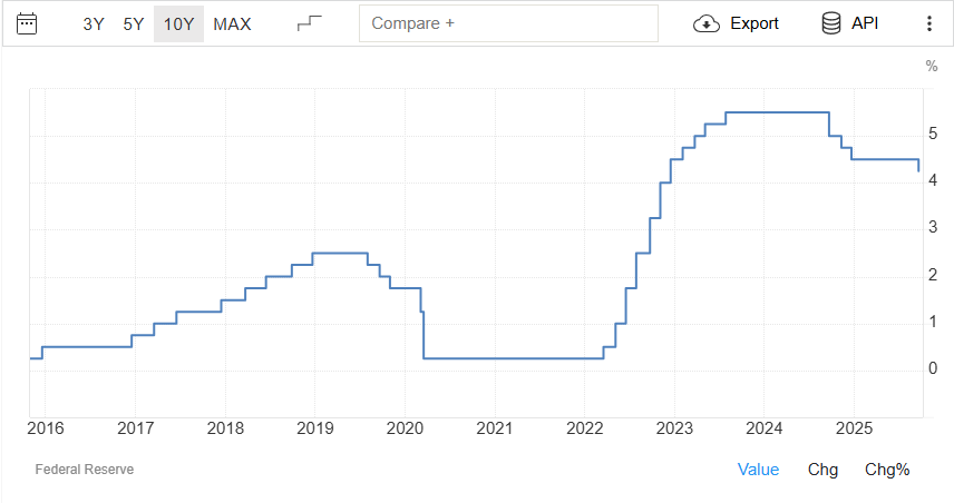 On 17 September 2025, the Federal Reserve cut the target range for the federal funds rate by 25 basis points to 4.00–4.25 percent. It was the first reduction of the year after anticipated moves in April and June were deferred due to uncertainty around the inflation and growth effects of the Trump tariff package. The statement cited progress toward the 2 percent inflation goal, marginal labour-market cooling, and moderate growth. It balanced the risk of overtightening against policy lags, and noted that tariff pass-through, supply factors, and expectations would take time to filter through the economy.