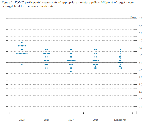 The Summary of Economic Projections on 17 September 2025 showed a median policy-rate path that left room to ease further, with the year-end 2025 median below the pre-meeting effective rate. In the dot-plot, 2025 projections clustered just under 4.0 percent, with a visible spread from roughly 3.0 to 4.5 percent, indicating non-trivial dispersion. For 2026, dots tightened around the low-to-mid 3s; for 2027 they centred near 3.0 percent, with a few outliers closer to 2.5 percent; for 2028 the cluster drifted a little lower, broadly in a 2.7 to 3.2 percent band. The longer-run dots sat mostly between about 2.5 and 3.5 percent, implying little change to longer-run estimates. Relative to the prior projection round, the central trajectory for 2025 appeared modestly lower, while the longer-run view changed little. As in previous cycles, participants emphasised data dependence; a clearer disinflation trend and continued labour-market rebalancing were presented as prerequisites for any acceleration in easing.