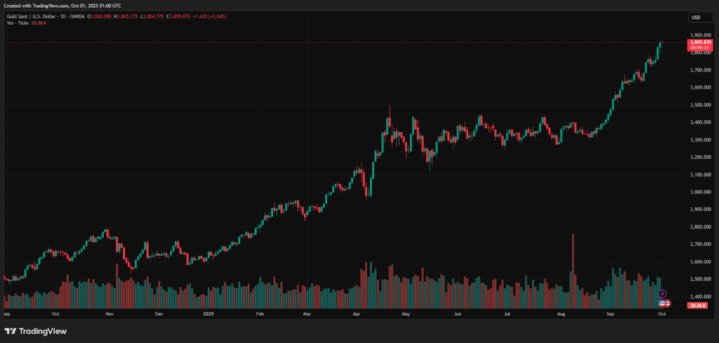 Gold held near all-time highs through September, rising about 11 to 12 percent for the month and printing a record intraday near $3,871 per ounce as shutdown worries and softer US labour data lifted Fed-cut odds; spot prices climbed from roughly $3,480 on 1 September to above $3,830 by 29 September, before touching fresh highs on the 30th. Against that backdrop, safe-haven demand and lower expected real yields remained the dominant drivers, with gold’s best monthly gain in over a decade as markets priced additional easing. ETF flow reports pointed to sizeable September inflows into the largest gold funds, reinforcing the bid. For crypto, the implication is a tighter competition for marginal risk capital when bullion sits at or near record levels, particularly if a firm US dollar and conservative equity tone persist; this dynamic likely contributed to choppier post-FOMC flows and a less supportive liquidity backdrop for beta assets.