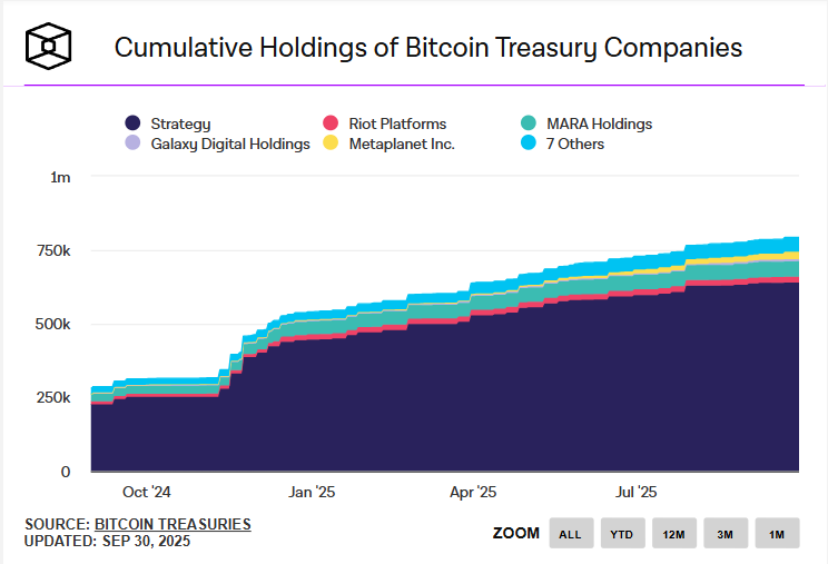 By 29 September 2025, tracked corporate treasuries collectively held more than 750,000 BTC, with Strategy the dominant holder alongside Marathon, Riot, Galaxy Digital, Metaplanet, and others. Funding continued to rely on multiple at-the-market programmes: the 22 September Form 8-K outlined draws across common-stock and preferred-stock ATMs, and disclosures for 22–28 September noted $128.1m in net proceeds, a portion of which funded the 196 BTC purchase that week, with the remainder retained for general corporate purposes, including preferred-stock dividends.