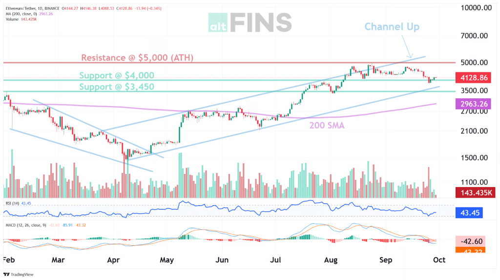 Ether’s September range was well defined. Daily closes showed a start near $4,314 on 1 September, a rise toward the mid-$4,000s around 17–18 September, and a dip to the high-$3,800s on 26 September during the most concentrated deleveraging phase. The $4,000 figure acted as a pivot, with multiple tests and defences during the month; it was temporarily lost on 25 September before stabilisation resumed. The pattern broadly mirrored bitcoin’s arc, with beta slightly higher on down days.
