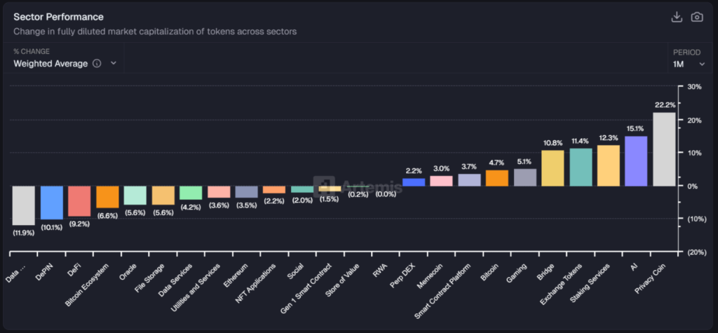 Sector moves were dispersed. Leaders were Privacy Coin up 22.2 per cent, AI up 15.1 per cent, and Staking Services up 12.3 per cent, with Exchange Tokens and Bridge also positive. Bitcoin’s sector sat in the green, while Ethereum’s sector was modestly negative, which is consistent with BTC’s firmer tape through mid-month. Laggards clustered in DeFi, DePIN, and data or oracle infrastructure, which finished lower as risk was pared back on down days. The split points to a market rewarding clear, cash-flow or utility narratives, and penalising leverage-sensitive segments when liquidity thins.
