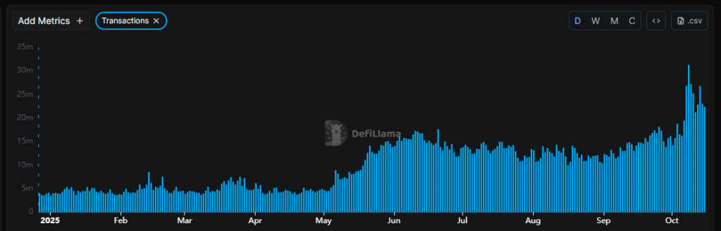 Raw throughput on BNB Chain has been exceptional in recent weeks. DefiLlama shows ~26,760,000 transactions and ~3,480,000 active addresses in twenty-four hours around mid-October. Those are near peak prints among general-purpose chains, and they explain why aggregate chain fees can still reach multi-million totals even when unit costs per transaction sit at cents. Throughput at this level changes UX expectations for consumer apps, which can deliver near-instant responses without the need for bespoke rollup infrastructure.