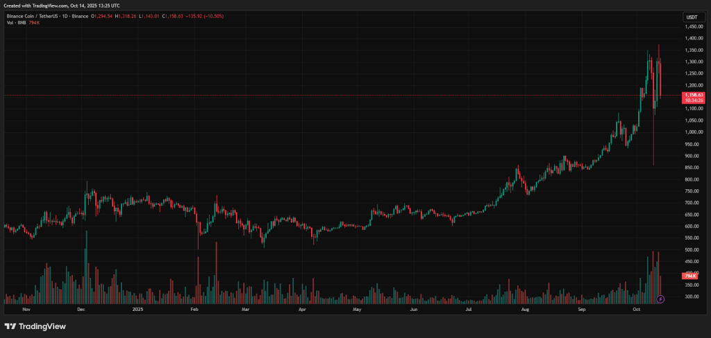 BNB’s breakout in early October represented a clear shift in its market cycle. After years of sideways movement, the token finally broke above $1,200 on 7 October, then extended higher into mid-October before calibrating downward. During 10–11 October, the market experienced a violent deleveraging which is roughly $19 b of positions were liquidated in about twenty-four hours, contributing to a sharp reversal and abrupt cooling in momentum. That drawdown aligned with macro shocks, including tariff news and risk-asset stress, and triggered a visible reset in daily indicators.