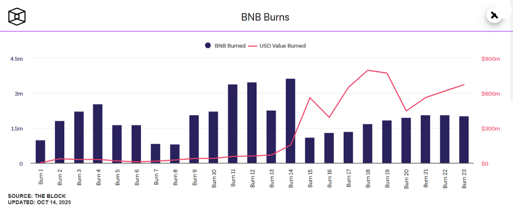 BNB’s economic design is simple to describe and powerful in practice. Two burn channels reduce outstanding supply. The Auto-Burn is a formula-driven quarterly event that references block production and the average BNB price over the period, and it continues until the long-stated total-supply target of 100,000,000 BNB is reached. The BEP-95 mechanism burns a fixed share of gas fees in real time, directly linking activity to float reduction. In July, the ecosystem completed the 32nd Auto-Burn, permanently removing 1,595,599.78 BNB, worth roughly $1.02b at the time.