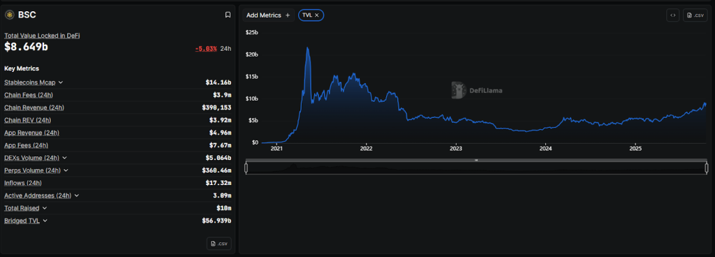 Current readings show BSC operating with deep liquidity and broad participation. TVL is $8.649b, supported by a $14.16b stablecoin base that keeps routing tight when flows pick up. Trading is led by spot at $5.064b of DEX volume, complemented by $368.46m in perps. Participation breadth remains high, with 3.09m active addresses. Capital is still leaning in, with $17.32m of net inflows. On the economics side, chain fees are $3.9m, app fees $7.67m, app revenue $4.96m, and chain revenue $398,153. Cross-chain liquidity is robust, with bridged TVL at $56.93b, and the view includes total raised of $10m. These figures are live “as of writing” and align with DefiLlama’s BSC chain metrics.